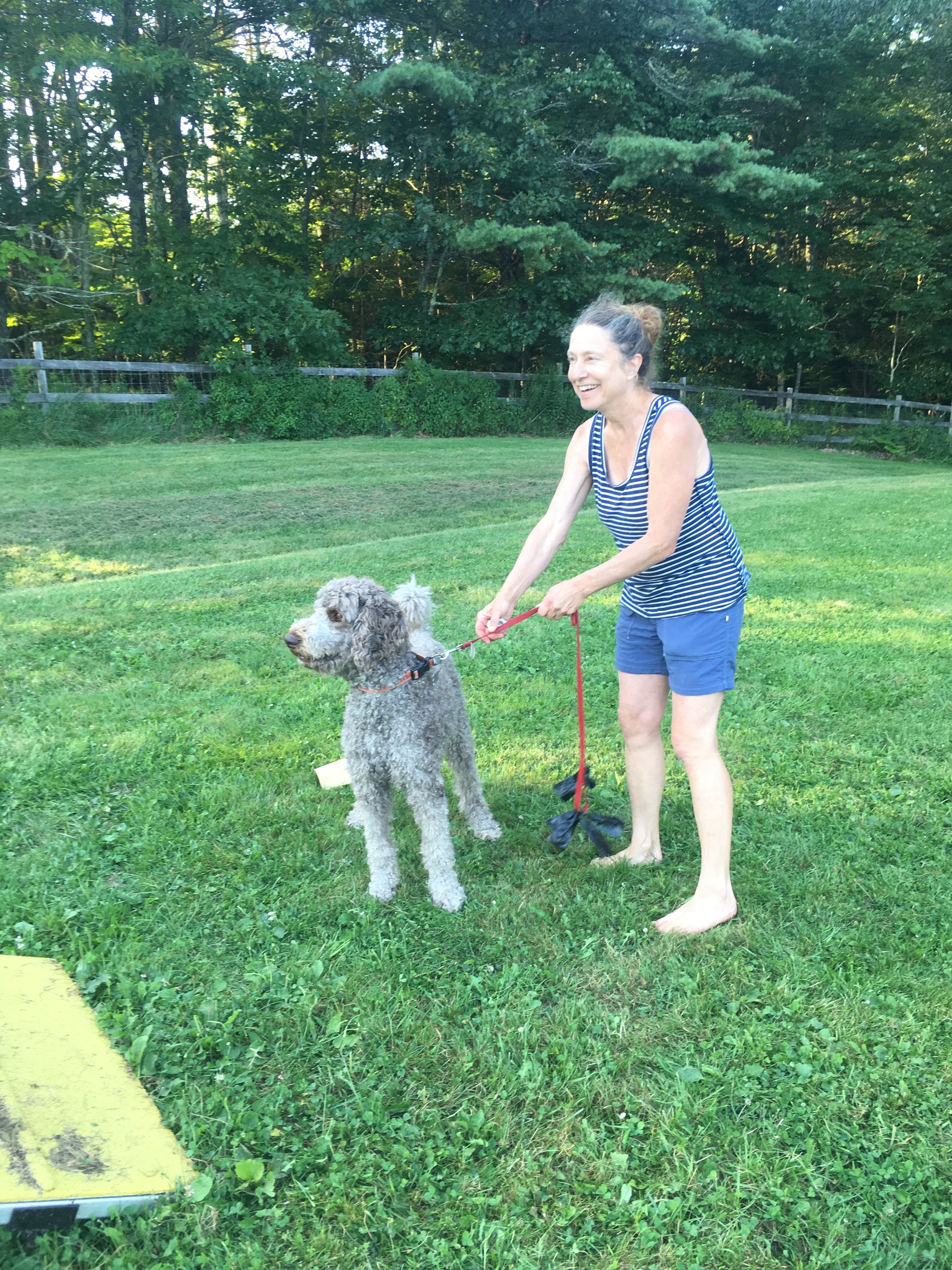 But when problem barking doesn’t stop, I can punish it by taking away a privilege. Overly excited barking dog goes behind a gate, into a crate or car, or we can move further away from whatever is stimulating the behavior. Losing a desired privilege weakens the behavior it follows. When the dog stops barking, I can give back the privilege. It’s not all or nothing, I can add and subtract incrementally, according to what the dog and I both need.